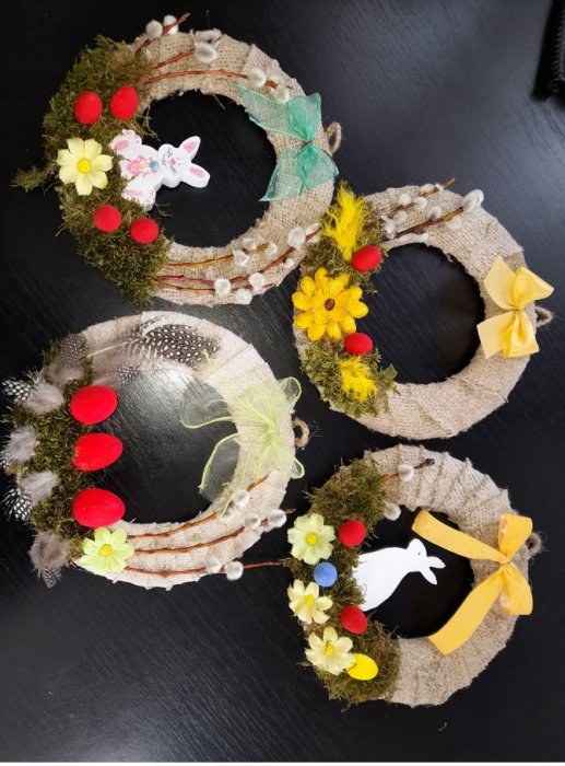 A csoport minden tagja képességeihez mérten részt vállalt a húsvéti dekoráció készítésében. Kreatív megvalósítási ötletekkel, színes rajz javaslatokkal és elképzelésekkel gazdagítva a dekorációs elemeket.  Csodás alkotások születtek gipszből, természetes anyagok, szallagok és újrahasznosított tárgyak felhasználásával.