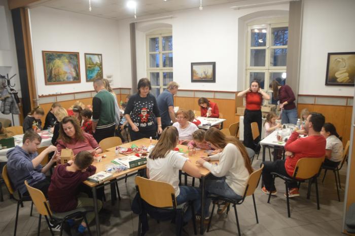 Kézműves foglalkozással kezdtük programunkat. Készültek a karácsonyi angyalok, a szebbnél szebb díszek fenyőtobozból, a gyöngyökkel és rajzokkal díszített fakorongok, karácsonyi díszek, képeslapok, adventi kalendáriumok. Sok anyuka sütött mézeskalácsot, gyerekek és a felnőttek nagy örömmel álltak neki díszítésüknek.