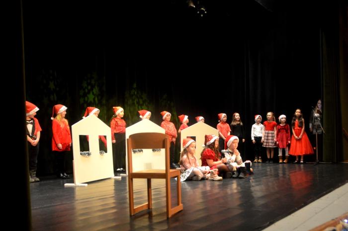 A színpadon az ünnepi köszöntő után fellépő „Csütörtöki Szalon” tagjaitól adventi hangulatot teremtő verseket hallhattunk. A gyönyörű versek elvarázsoltak bennünk, egyben jelezték felénk, hogy itt az ideje az elcsendesedésnek, megnyugvásnak, lelkünk ünnepbe öltöztetésének. Ezt követően a Haller János Iskola I. osztályos tanulói vonultak ki a színpadra. A 27 pirossapkás gyerek által előadott versek, énekek lenyűgözték az ünnepségen résztvevőket, ezért vastapssal köszönték meg a kis nebulók műsorát.