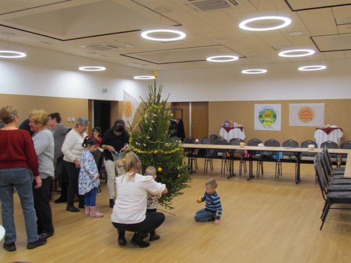 A korábbi évekhez hasonlóan az ünnepség kezdetén a gyerekek bevonásával feldíszítettük egyesületünk karácsonyfáját, vásárolt és a tagok által hozott díszekkel, szaloncukorral. Az idén az arany volt a díszítés alap színe. Nagyon jól mutatott az idén átadott új épület tánc termében.