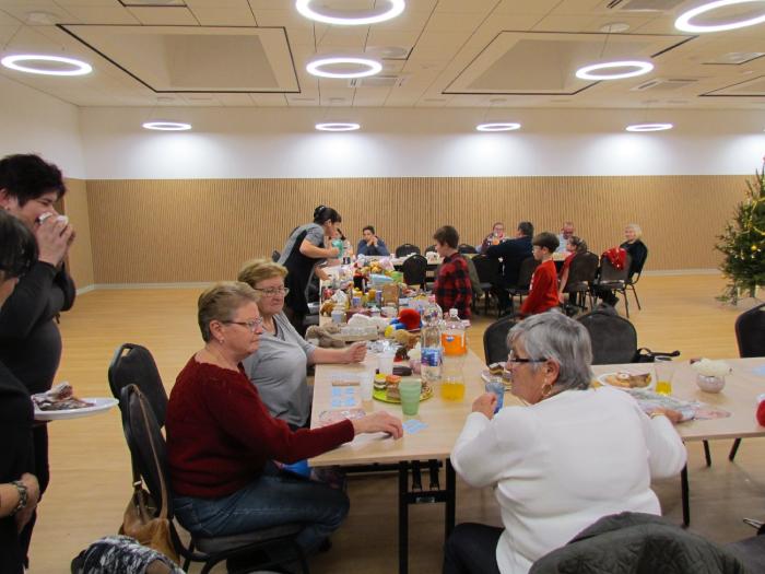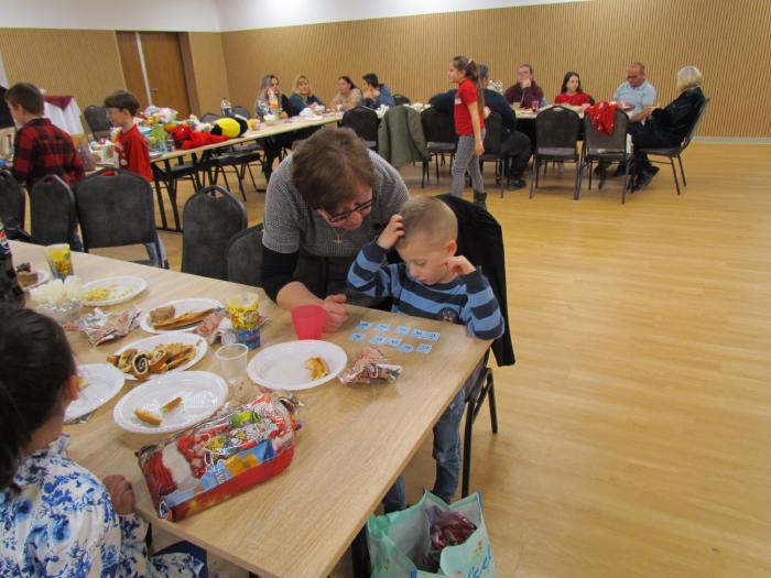 A Mikulás okozta izgalmak feldolgozása szerény vacsora közben került sor. Ez úttal pizza volt a menü, melyet a tagok által készített és hozott sütemények egészítettek ki. Közben jócskán fogyott a tombola szelvény is. A vacsora után, a karácsonyfa mellett átadásra kerültek azok az élelmiszer csomagok, amelyeket a Nagycsaládosok Országos Egyesülete révén Termelők a Nagycsaládokért programban kapott egyesületünk. Az emelkedett hangulatot tombola ez úttal is a tombola sorsolás fokozta, ahol különféle értékes nyeremények mellett a fődíj a feldíszített karácsonyfa volt. Az idén egy olyan családunknak kedvezett a szerencse ahol a „Kati mama” az egész utcának fogadott nagymamája.