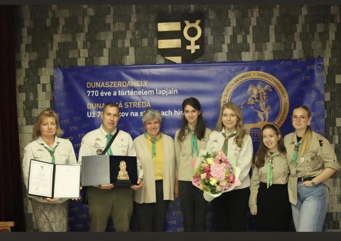 A fénykép 2025-ben készült, Dunaszerdahelyen, amikor a 10. számú Szent György cserkészcsapat átvehette a város Pro Urbe-díját, balról a harmadik Ajpek Gabriella.