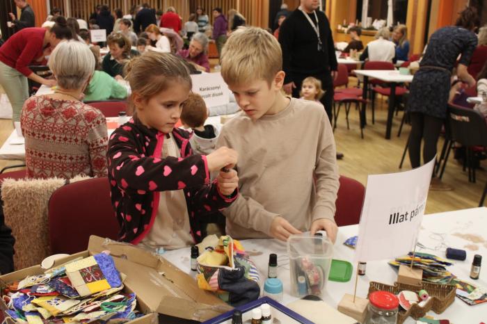 A közös éneklést követően a terem valóságos adventi műhellyé alakult. A szervezők összesen 11 különböző állomással készültek, ahol kicsik és nagyok egyaránt kiélhették kreativitásukat. A szorgos kezek alatt sorra születtek a: