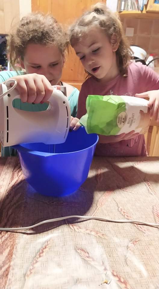 Két  kép különösen tetszett. Két kislányát fotózta Édesanya, amin a kapott nápolyit majszolják, a másikon pedig a kapott lisztből keverik éppen a palacsintatésztát .